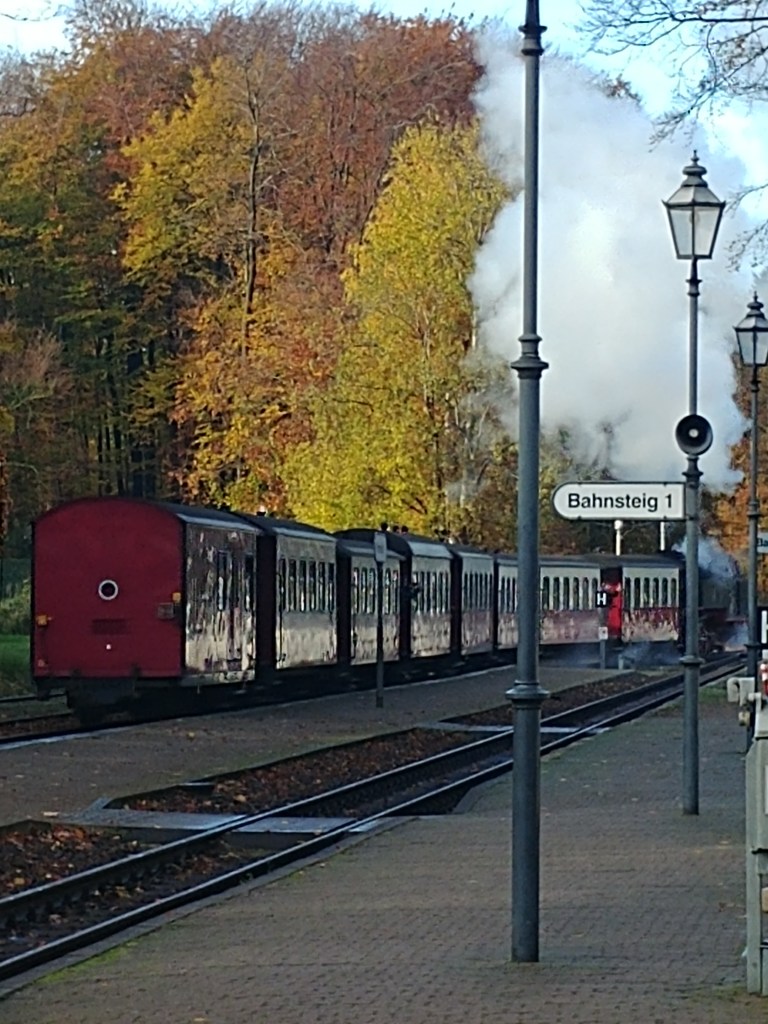 Tatsächlich war ich auch ein wenig aufgeregt. Ich bin schon bestimmt seit 25 Jahren nicht mehr mit dem Molli gefahren. Und ich hab’s ebenso genossen. Als kleines Kind durfte ich nie draußen stehen. Meine Oma hat es mir immer verboten. Wegen dem Qualm und dem Gestank. Ist ja gesundheitsschädigend. Der Molli ist nämlich eine Dampfeisenbahn, die noch richtig mit Gebimmel fährt. Bimbimbim … so fährt sie durch die Ortschaft. Beim Anfahren geht es noch richtig schschsch … Herrlich. Seit 1886 fährt der Molli. Die Wagen und die Lok sind gefühlt genauso alt. Ein Fahrgefühl voller Nostalgie.