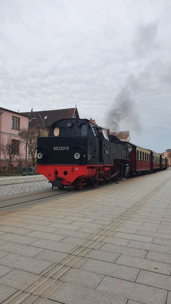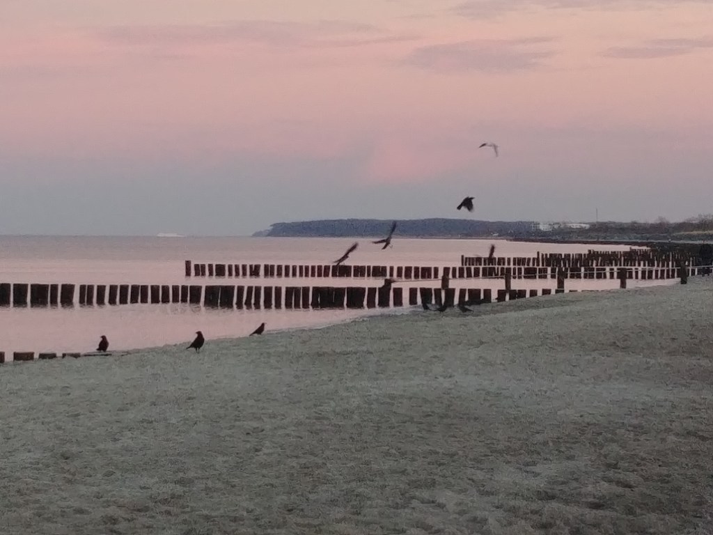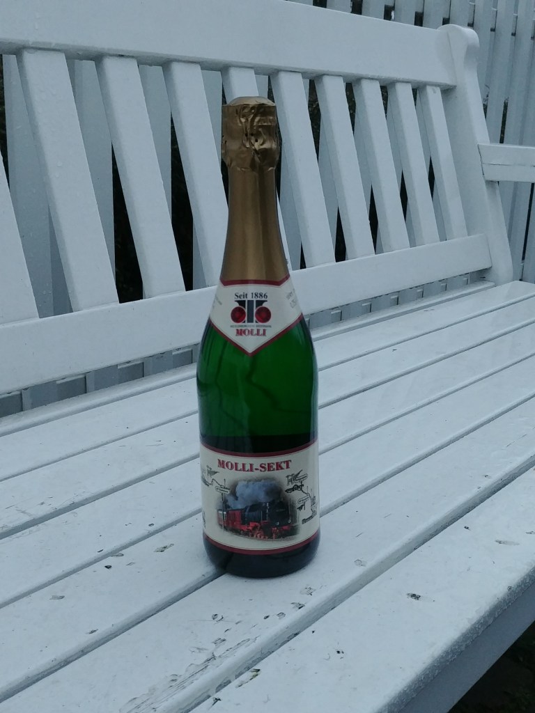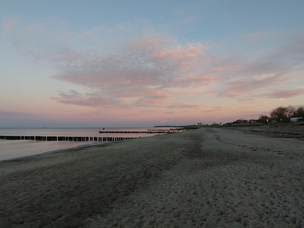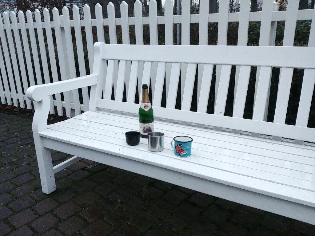 Am Sonntag fuhren wir alle mit dem Molli nach Heiligendamm an den Strand. Mit Glühwein im Rucksack. Die Tage zuvor hatten wir Sonne und blauen Himmel. Ein Zustand, der schon die ersten Glückshormone ausschüttete. Doch ausgerechnet am Sonntag gab’s Regen. Nun ja, bei Sonne und warmen Temperaturen schmeckt ja kein Glühwein, also war das Wetter auch okay (scheinbar schien aber im restlichen Deutschland die Sonne). So saßen wir am Strand auf der Bank unter zuzwinkernden Blicken von anderen Spaziergängern und tranken unseren Glühwein und ließen unserer guten Laune freien Lauf.