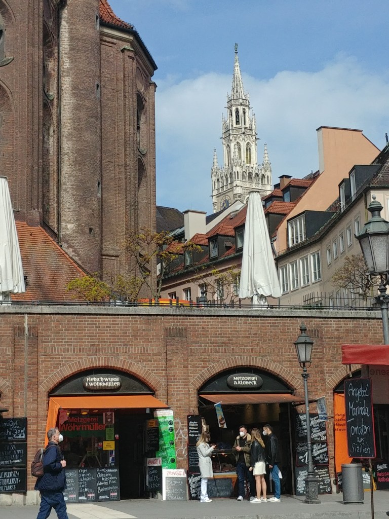 Und so saugte ich zwei Tage bei traumhaftem Sonnenschein und blauem Himmel den Flair vom Viktualienmarkt ein. Aber nicht nur ich, die Stadt war außer Rand und Band. Isar, Gärtnerplatz, Viktualienmarkt … alle Orte waren voll von Menschen, die einfach nur draußen in Geselligkeit sein und „ganz normal“ ihren Drink genießen wollten – eigentlich ein vertrautes Bild aus den letzten Sommer. Nur mit dem traurigen Unterschied, dass Wirtschaften und Cafes geschlossen bleiben müssen und die Plätze übersät von Plastik-to-go-Aperol-Spritz-Bechern waren. Ein skurriles und absurdes Spiegelbild über die derzeitige Situation in unserer Gesellschaft.